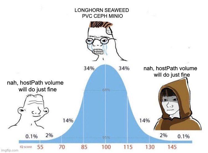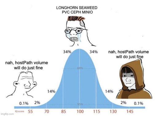 Ha, I went down the whole Ceph and Longhorn path as well, then ended up with hostPath and btrfs. Glad I’m not the only one who considers the former options too much of a headache after fully evaluating them.