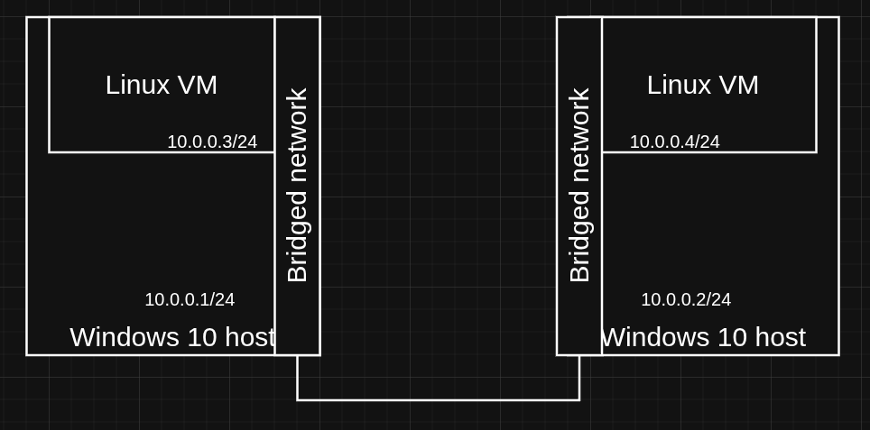 tcpdump -non both Linux VMs, and Wireshark on the Windows hosts, while doingping -b 10.0.0.255. Or trigger a broadcast ARP by ping-ing a non-existing IP in the same network. Those should go through all bridge and switch devices, independent of IPs and routing setup.)I think you need four distinct MAC addresses for this setup, are they all different?