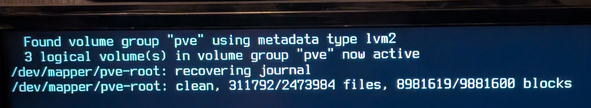 Recently, when I reboot my Proxmox hardware, I’m greeted with this message after the bootloader splash screen. It won’t progress any further, even after letting it sit overnight.