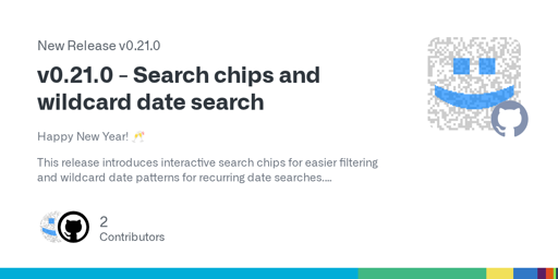 Spurred by some household needs, the big thing in v0.21 is an easier search interface with search chips, but maybe more interestingly: wildcard date search.