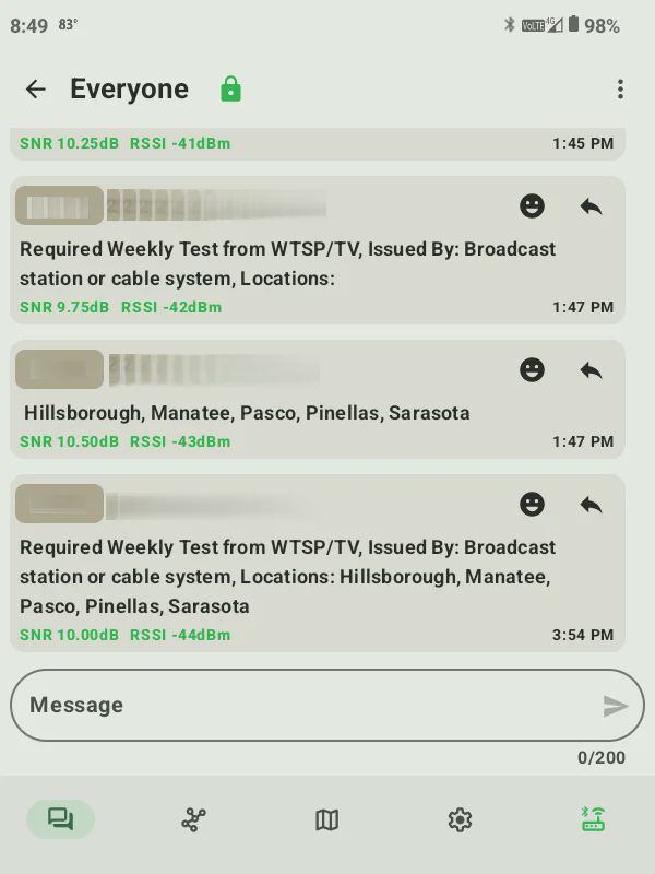 2026-04-02T15:32:31.201Z INFO [Meshtastic_SAME_EAS_Alerter] Attempting to send message over the mesh: 📖Received Required Weekly Test from WTSP/TV, Issued By: Broadcast station or cable system, Locations: Hillsborough, Manatee, Pasco, Pinellas, Sarasota